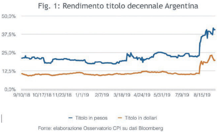 Il fatto di avere una moneta sovrana non impedisce che un paese faccia default sul debito. La ragione principale, ma non l’unica, è che una buona parte, circa tre quarti, del debito argentino, è denominato in valuta estera. Perché il governo argentino non ha emesso in misura maggiore titoli in pesos? La realtà è che gli investitori internazionali cercano di evitare di investire in una valuta che può essere manipolata dal debitore e quindi su di essa chiedono un premio per il rischio più elevato. Nel caso dell’Argentina, data la sua storia, il timore di investire in pesos era particolarmente elevato: infatti, il titolo in pesos costava attorno al 20 per cento, quello in dollari al 10 per cento (si veda Fig. 1). I tassi interni avrebbero potuto essere tenuti bassi dalla Banca centrale, stampando più moneta, ma questo avrebbe alimentato ulteriormente le già alte pressioni inflazionistiche. Inoltre, l’Argentina aveva bisogno di valuta estera per ricominciare a importare materie prime e altri prodotti esteri indispensabili. Infine, il governo Macri aveva smantellato quell’apparato di vincoli finanziari su banche, imprese e persone fisiche che rappresentava un vero e proprio sistema di repressione finanziaria volto a piazzare il debito pubblico presso i residenti e impedire libere scelte finanziarie da parte degli argentini.