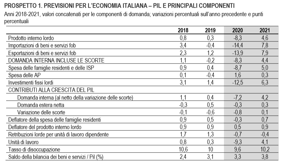 Nel 2020 il pil italiano si contrarrà dell’8,3 per cento, per poi subire gli effetti del cosiddetto rimbalzo e risalire nell’anno successivo di un più contenuto 4,6 per cento. Sono alcune delle stime che l’Istat ha raccolto nel suo rapporto sulle prospettive economiche del paese per il biennio 2020-2021, che quest’anno sono state accompagnate da un surplus di cautela metodologica, viste le difficoltà di gestire i modelli previsionali in una fase di shock per l’economia mondiale.