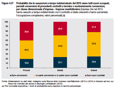 L’effetto si coglie, in particolare, sulle piccole imprese. La riforma normativa, dice l’Istat, ha attivato una domanda di lavoro aggiuntiva tra le aziende sotto i 50 addetti, che altrimenti, con una probabilità del 56 per cento, non avrebbero aggiunto occupazione dato che nel 2014 non assumevano. Per le piccole imprese il Jobs Act è stato lo “strumento più frequentemente scelto” per agganciare la ripresa della domanda di lavoro, dopo la stasi. E’ poi più probabile che si parli di nuovi contratti anziché di conversioni di contratti a termine, senza che gli sgravi abbiano funzionato da “fattore discriminante” per i contratti a tempo indeterminato, dice Istat. Invece per le imprese medie (50-249 addetti) e grandi (almeno 250) – per cui vale il superamento dell’art. 18 –, che avevano già aumentato gli addetti nel 2014, il contratto a tutele crescenti ha rafforzato una tendenza in atto con la decontribuzione a fare da “potente” incentivo, soprattutto per le grandi.