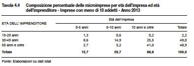 I giovani avrebbero forse più convenienza a rivolgersi ai loro coetanei piuttosto che confidare nella “staffetta” con le generazioni genitrici. Istat segnala appunto che, sebbene in un sistema dove il tasso di mortalità delle aziende tra il 2008 e il 2013 è salito di un punto – unico caso nell’Unione europea – mentre la natalità resta contenuta, sono le microimprese guidate da giovani a “brillare”. La “performance occupazionale” delle aziende con meno di dieci addetti, ovvero il 95 per cento del sistema produttivo, guidate da persone fino ai 49 anni è stata migliore rispetto a quella di società gestite da anziani, a prescindere dal livello di tecnologia e dall’età dell’azienda, che può essere sia “nuova” sia “ereditata”. I vantaggi occupazionali legati alla giovane età degli imprenditori, dice l’Istat, sono massimi nelle imprese giovani in settori manifatturieri ad alta tecnologia (farmaceutica, elettronica, ecc.) e studi professionali (legali, architetti) di antica creazione.