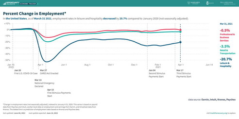 Primo dato: turismo e ristorazione sono i campi più colpiti dalla crisi anche negli Stati Uniti, in proporzione addirittura maggiore rispetto all’Italia. Il tasso di occupazione al 31 marzo 2021 era crollato del 20,7 per cento rispetto ai numeri pre-pandemia. Più del triplo rispetto a qualsiasi altro settore. Dalla California alla Pennsylvania le imprese si lamentano di non riuscire a trovare abbastanza personale, come a Firenze o sul Garda.