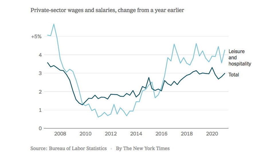 Terzo, e apparentemente sorprendente: per turismo e ristorazione i salari continuano a essere in stabile aumento, a un ritmo più sostenuto della media degli altri settori. Il trend è iniziato nel 2016 e negli Usa non ha risentito dell’impatto della pandemia. Nel frattempo però stanno crescendo anche l’inflazione e il costo della vita. Evidentemente, dati i numeri sulla disoccupazione, in modo più che proporzionale dei salari.