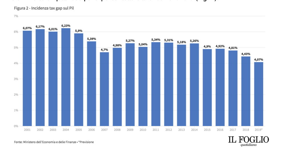 In realtà, negli ultimi anni il livello di evasione fiscale è diminuito: il tax gap, che nel 2014 era quasi 110 miliardi di euro, è sceso del 6 per cento nel 2018. Questo deriva da una forte riduzione del gap dell’Iva, dell’Ires e dell’Irap. Anche l’introduzione del canone Rai in bolletta ha contribuito positivamente: da quando nel 2016 il governo Renzi ha avviato la misura, le famiglie insolventi sono passate da 7,5 milioni dell’anno precedente a 1,7 milioni (l’importo del canone è di 90 euro a famiglia).