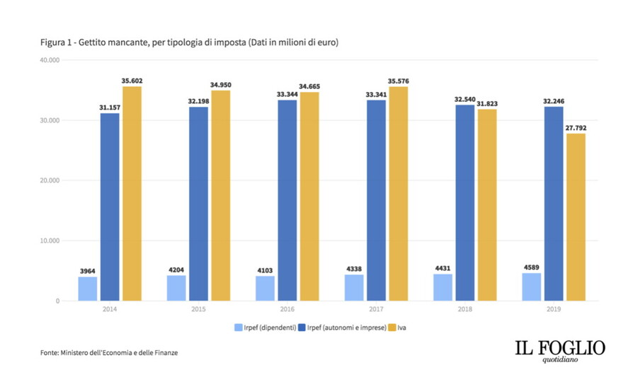 Questa diminuzione generalizzata riguarda quasi tutte le imposte. Tuttavia, l’Irpef pagato dagli autonomi e dalle imprese continua a registrare un elevato livello di evasione. L’Irpef, alla cui modifica il governo sta lavorando da diverse settimane, è l’imposta più evasa in Italia, con un gettito mancante di 32,2 miliardi di euro nel 2019, in diminuzione di 300 milioni di euro rispetto all’anno precedente.