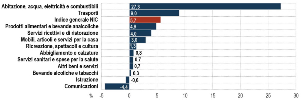 L’aumento dei costi delle materie prime alimentari e dei beni energetici si riflettono sui prezzi di abitazioni, elettricità e combustibili, cresciuti quasi del 30 per cento. Solo istruzione e comunicazioni registrano una flessione. I dati Istat
