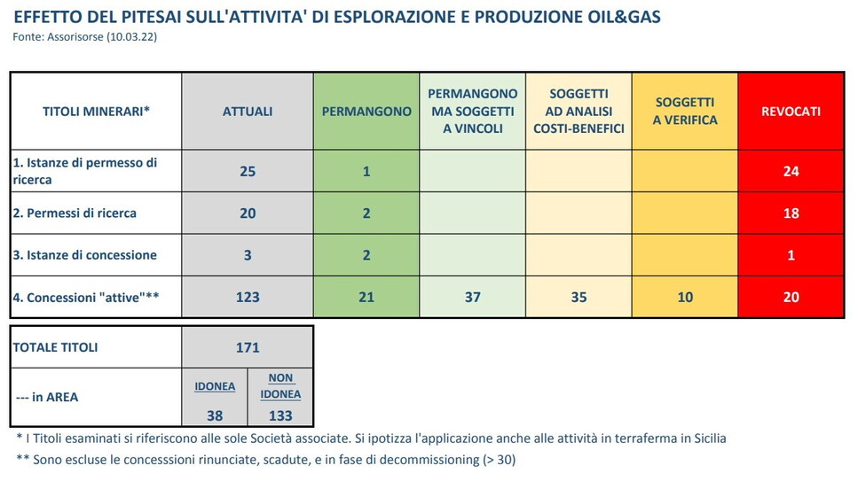 Non solo. Il piano colpisce anche le concessioni già attive. "Relativamente alle 123 concessioni minerarie, di cui 108 relative al gas, oltre il 70 per cento ricade in aree definite come "non idonee", limitando fortemente le prospettive di produzione per effetto delle incertezze sulla possibilità di effettuare nuovi investimenti. Di queste concessioni, 20 saranno revocate e 45 saranno soggette a verifica per stabilire il prosieguo o meno delle attività", si legge nella relazione di Assorisorse.
