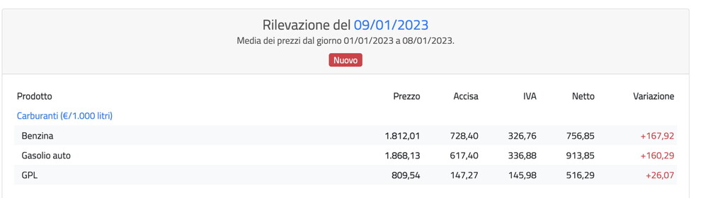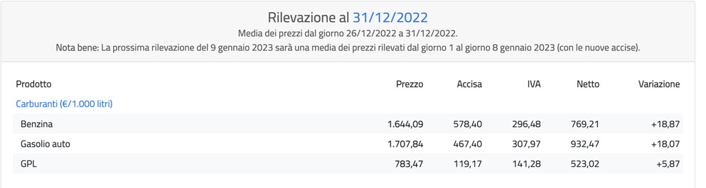 I dati dicono che il prezzo medio della benzina praticato dagli impianti di distribuzione tra l'1 e l'8 gennaio è stato 1,81 euro/litro, quello del gasolio 1,86 euro/litro. Entrambi i carburanti hanno subìto un aumento rispettivamente di 16,8 e 16 centesimi di euro al litro rispetto alla settimana precedente, ma le accise erano più basse di 18,3 centesimi compresa l'iva. Inoltre, se si guarda la media mensile nell'arco del 2022 i prezzi non sono "fuori controllo" come ripetono da giorni alcune associazioni dei consumatori e alcuni ministri: quando il governo Draghi introdusse i primi sconti sulle accise, la benzina costava in media 2 euro/litro e il gasolio 1,9 euro/litro.