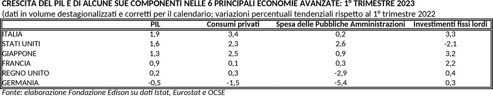 Dopo aver brillato nel 2021 e nel 2022, l’Italia ha sorpreso tutti anche nei primi tre mesi del 2023. La nostra economia, infatti, risulta cresciuta dell’1,9 per cento su base tendenziale rispetto al primo trimestre dello scorso anno. Ciò grazie ai positivi secondo e terzo trimestre del 2022 (rispettivamente, più 1 e più 0,4 per cento gli incrementi congiunturali sui trimestri precedenti) e grazie anche a un brillante primo trimestre 2023 (più 0,6 per cento), dopo la temporanea piccola battuta d’arresto del quarto trimestre 2022 (meno 0,1 per cento). Nel primo trimestre del 2023 l’Italia è stata in assoluto la migliore per crescita tra le prime sei economie avanzate, sia su base congiunturale sia su base tendenziale, come mostra la tabella in basso. Sui 12 mesi, in particolare, ha preceduto, nell’ordine, Stati Uniti (più 1,6 per cento), Giappone (più 1,3 per cento), Francia (più 0,9 per cento), Regno Unito (più 0,2 per cento), mentre la Germania è sprofondata in recessione (meno 0,5 per cento).