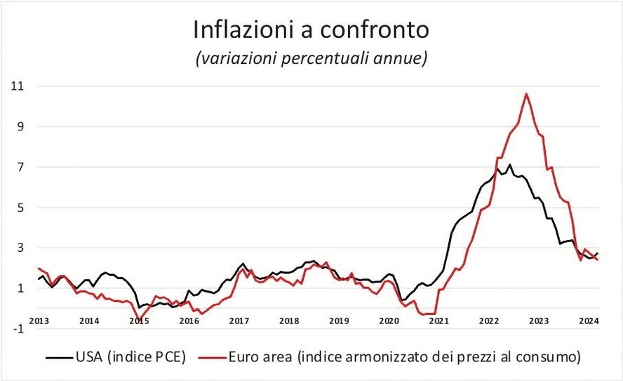Negli Stati Uniti l’inflazione è partita prima ma si è anche fermata prima, e a un livello più basso. La Bce ha deciso di risollevare I tassi, dal livello negativo (-0,50) in cui si trovavano, nel luglio 2022, quando l’inflazione era già vicina al 9 per cento e oltre l’obiettivo da più di un anno. L’aumento è stato rapido, a settembre 2023 il tasso Bce era al 4 per cento attuale. Da allora l’inflazione ha cominciato a scendere. Chi scrive pensa che l’errore della Bce sia stato duplice. Primo, mantenere tassi negativi troppo a lungo prima della pandemia, in particolare nel trennio 2017-2019, il che ha reso più impervia la risalita dopo la giusta espansione pandemica. Secondo, ritardare la correzione dei tassi nel 2021, illudendosi che l’esplosione dei prezzi di energia e beni alimentari si sarebbe arrestata spontaneamente senza trasmettersi alle altre componenti dei prezzi.