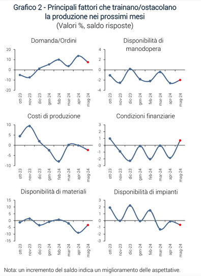 A preoccupare è invece il dato legato ai costi di produzione: il saldo del numero di imprese che li considerano come un fattore di traino rispetto a quelle che invece li considerano un fattore di ostacolo si riconferma negativo e diminuisce ulteriormente, passando da -0,1 per cento ad aprile a -2,4 per cento a maggio. In altre parole, il costo della produzione, evidentemente percepito ancora molto alto, rappresenta un limite allo sviluppo industriale del nostro paese. Al centro delle cause dell'aumento di questo tipo di costi troviamo ancora i rincari dei prezzi dell'energia e delle materie prime derivati dalla situazione geopolitica internazionale.
