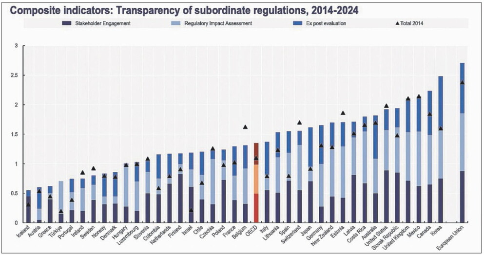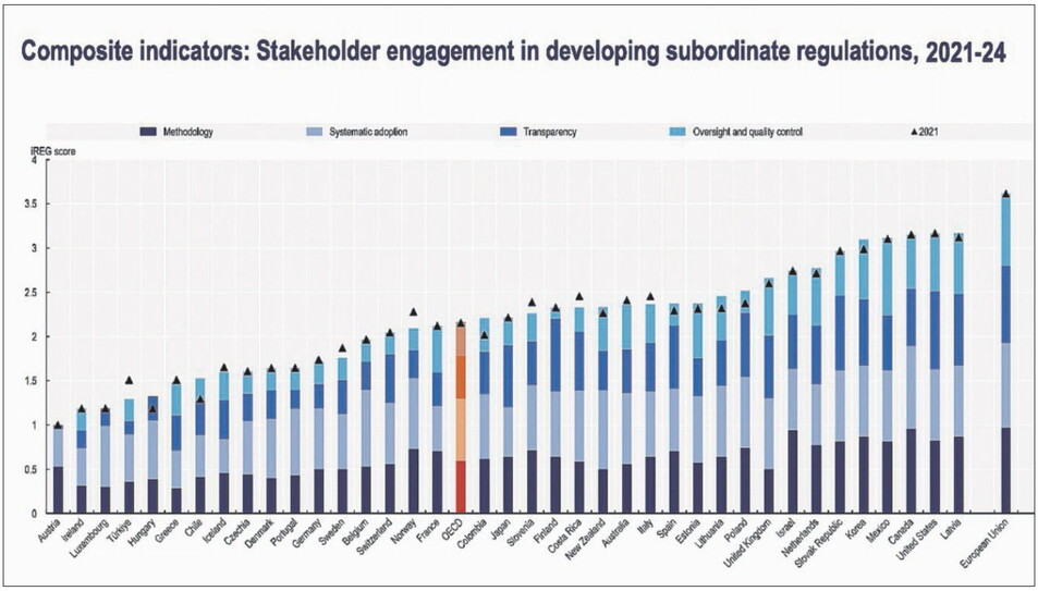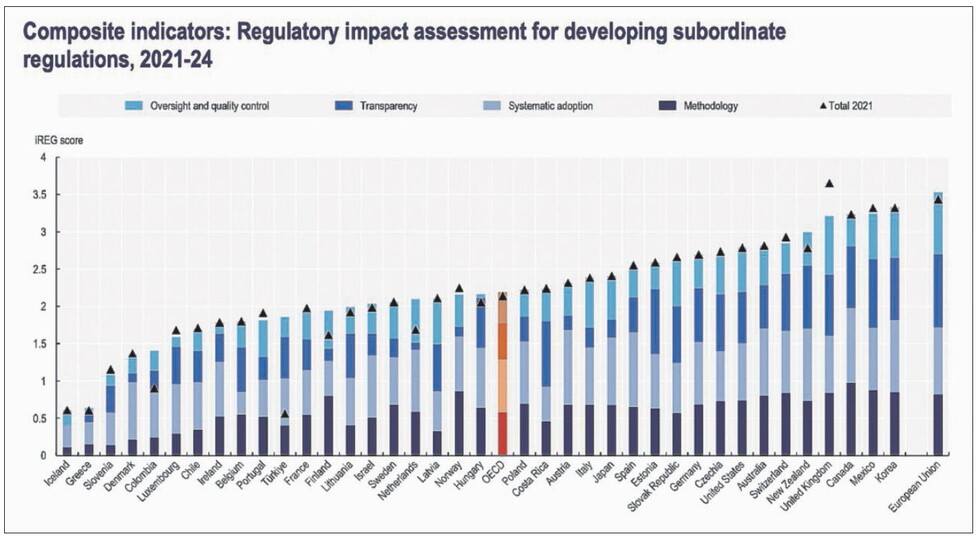 Molte regolamentazioni pubbliche sono considerate eccessivamente gravose per cittadini e imprese. Molte altre sono considerate inefficaci, a causa della scarsa capacità dei governi. Questo è il motivo per il quale l’Ocse da tempo svolge indagini e fa proposte in materia di regolazione. Il recentissimo Rapporto sulle politiche regolatorie 2025 è la quarta edizione del “Regulatory Policy Outlook”. La maggior parte dei dati, inclusi gli indicatori compositi, deriva dalle indagini sugli indicatori dei regolatori (Regulatory Indicator Surveys) condotte negli anni 2014, 2017, 2021 e 2024. Le indagini approfondiscono tre princìpi fondamentali della “raccomandazione” del 2012: coinvolgimento degli “stakeholders” (i soggetti interessati), valutazione di impatto della regolazione (RIA), valutazione ex post. Ogni indicatore composito è formato da quattro categorie: adozione sistematica (rileva i requisiti formali e la frequenza con cui questi sono applicati nella pratica); metodologia (raccoglie informazioni sui metodi utilizzati); supervisione e controllo di qualità (registra il ruolo degli organismi di controllo e la disponibilità pubblica delle valutazioni); trasparenza (raccoglie dati relativi ai princìpi di governo aperto, come ad esempio la pubblicazione delle decisioni governative).
