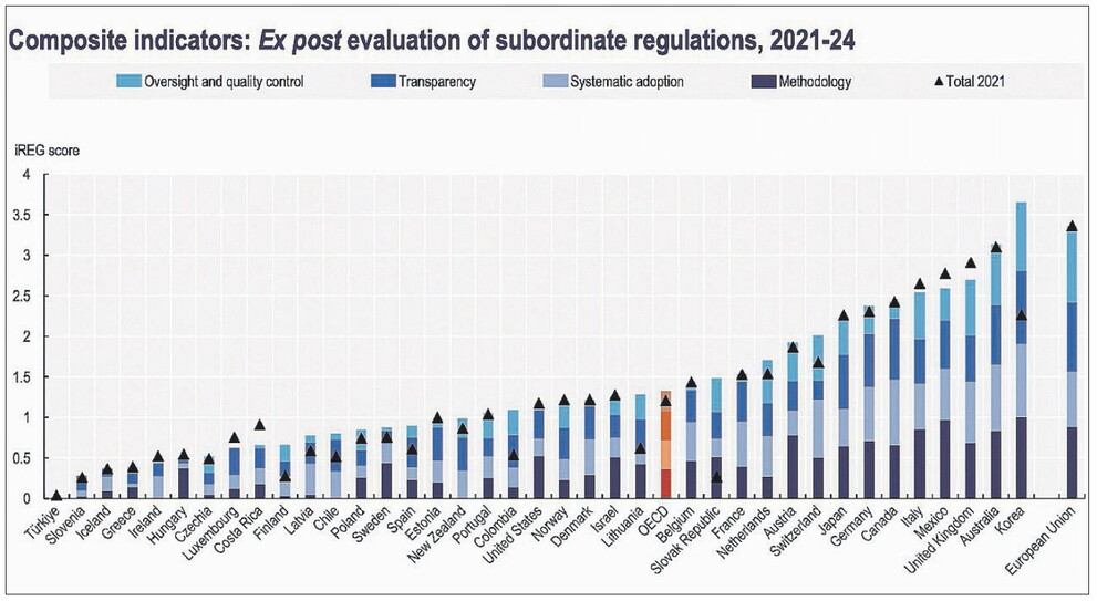 I punteggi sono misurati utilizzando il sistema iREG (Indicatori di Politica e Governance Regolatoria), e si articolano in quattro componenti principali, ognuna delle quali è rappresentata con un colore: Metodologia – blu scuro; Adozione sistematica – blu medio; Trasparenza – azzurro; Supervisione e controllo di qualità – celeste. I triangoli neri indicano i punteggi totali rilevati per l’anno 2021, e permettono di confrontarli con i risultati del 2024, mostrando così l’evoluzione delle pratiche regolatorie in ciascun paese. Gli indicatori considerati qui sono solo quelli relativi alla regolazione secondaria, che dipende più strettamente di quella primaria dall’esecutivo (governo e pubblica amministrazione).
