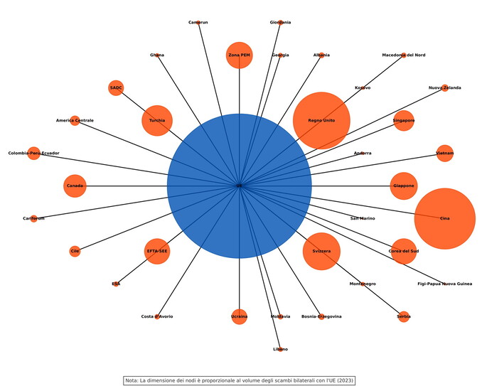 Qui una mappa dei vari accordi commerciali in vigore tra Ue e più di 70 paesi e regioni. La dimensione di ogni cerchio varia in base al volume degli scambi