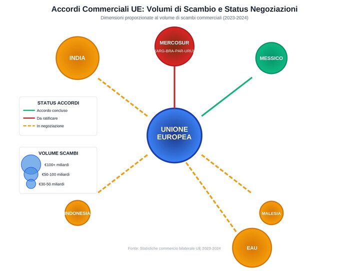 India, Indonesia, Malesia, Emirati Arabi Uniti e Mercosur: vanno avanti le trattative dell'Unione europea verso gli altri stati e regioni per tutelare il proprio commercio in vista dei dazi di Washington. Qualche mappa per capirci di più