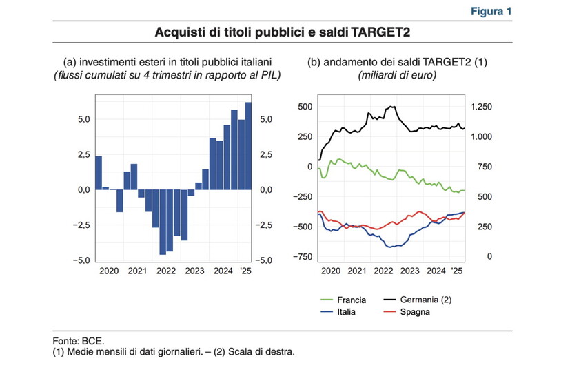 Negli anni recenti l’Italia ha mantenuto una gestione prudente delle finanze pubbliche. Con l’esaurirsi delle misure straordinarie, l’indebitamento netto si è ridotto drasticamente: si è più che dimezzato lo scorso anno e, secondo le stime del Governo, nel 2025 dovrebbe scendere al 3,0 per cento del PIL. Il saldo primario è tornato positivo e dovrebbe salire allo 0,9 per cento, mentre gli investimenti pubblici restano su livelli elevati in rapporto al prodotto. Il Piano strutturale di bilancio a medio termine del 2024, coerente con la nuova governance fiscale europea, mira opportunamente a riportare nei prossimi anni il disavanzo sotto il 3 per cento e a collocare stabilmente il rapporto tra debito e PIL su una traiettoria discendente. La tenuta dell’economia, la credibilità degli obiettivi di finanza pubblica e la prudenza nella gestione dei conti hanno rafforzato la fiducia nelle prospettive del Paese. La domanda estera di titoli pubblici è tornata su livelli elevati, contribuendo a un netto miglioramento del saldo TARGET2 (fig. 1). Il differenziale di rendimento tra i titoli decennali italiani e tedeschi è diminuito di circa 100 punti base negli ultimi due anni. Anche il giudizio delle principali agenzie di rating è migliorato, nonostante il difficile contesto geopolitico. Vi sono spazi per ulteriori miglioramenti. Sono sviluppi che vanno consolidati, proseguendo con determinazione nella direzione intrapresa. Guardando al futuro, la politica di bilancio dovrà tenere conto dell’invecchiamento della popolazione e dei nuovi impegni in materia di difesa, sostenendo la capacità produttiva. È essenziale innalzare stabilmente il ritmo di crescita dell’economia oltre quell’1 per cento stentato su cui sembriamo esserci assestati, preparando fin d’ora il terreno per la fase in cui non saranno più disponibili i fondi del Piano nazionale di ripresa e resilienza (PNRR).