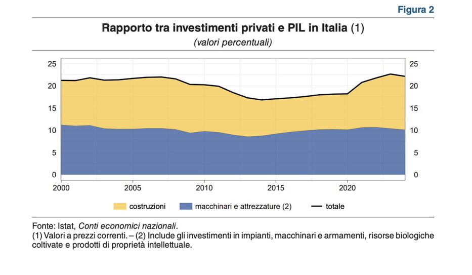 L’espansione della domanda interna è decisiva per lo sviluppo dell’economia italiana e, più in generale, dell’intera Europa. L’accumulazione di capitale è lo strumento per conseguirla: non solo sostiene direttamente la domanda, ma accrescendo il potenziale produttivo pone anche le basi per una crescita duratura, soprattutto in una fase di profonda trasformazione tecnologica. Negli ultimi anni gli investimenti in Italia sono tornati a crescere con vigore, superando – in rapporto al PIL – i livelli precedenti la crisi finanziaria globale (fig. 2). Le nostre indagini presso le imprese indicano che questa ripresa, avvenuta nonostante l’incertezza degli ultimi anni, è stata trainata dall’esigenza di adeguare il capitale produttivo all’innovazione digitale e alla transizione energetica e climatica. A sostenerla hanno contribuito consistenti incentivi pubblici: nel programma Transizione 4.0 sono stati maturati, tra il 2020 e il 2023, crediti di imposta per oltre 30 miliardi di euro.