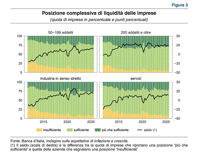 Banche, imprese e credito all’economia Il sistema bancario italiano è nell’insieme solido, ben patrimonializzato e oggi tra i più redditizi d’Europa. I rischi di credito restano limitati, grazie anche alle buone condizioni finanziarie delle imprese. Contribuisce l’ampio utilizzo dei prestiti garantiti dallo Stato, tutt’ora pari a un quarto di quelli alle imprese. I ricavi continuano a crescere, nonostante la discesa dei tassi di interesse, a conferma della capacità degli intermediari di adattarsi e diversificare la propria attività. Questi andamenti hanno alimentato le operazioni di concentrazione che hanno interessato il sistema bancario negli ultimi mesi. Quelle realizzate devono rafforzare gli intermediari, accrescerne ulteriormente l’efficienza e potenziare la capacità di offrire servizi migliori e più vicini ai bisogni della clientela. Il contesto in cui le banche operano non è però privo di rischi. L’economia internazionale resta fragile e i mercati finanziari potrebbero subire bruschi aggiustamenti in relazione a shock improvvisi. È quindi importante che le banche utilizzino le risorse generate in questa fase favorevole per rafforzare la capacità di affrontare scenari sfavorevoli, continuare a investire in tecnologia e sicurezza informatica e, soprattutto, sostenere la crescita dell’economia. Anche le imprese, nel complesso, si trovano oggi in condizioni migliori rispetto al passato. La leva finanziaria è su livelli molto contenuti e il rapporto tra debiti e PIL è poco più della metà della media dell’area dell’euro. Le riserve di liquidità restano abbondanti (fig. 3) e le aziende dispongono di un’ampia capacità di autofinanziamento. Queste due posizioni di forza – la solidità delle banche e quella del tessuto produttivo – devono convergere per rilanciare la crescita. L’andamento dei prestiti rappresenta una misura di questa convergenza.