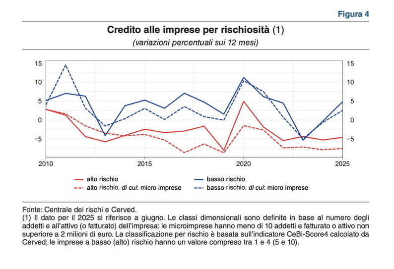 Il credito non è solo una variabile finanziaria: è la linfa che alimenta investimenti, innovazione e occupazione. È essenziale che non manchi alle aziende con buone prospettive di sviluppo, in particolare a quelle che investono nella transizione digitale ed ecologica. Negli ultimi mesi la dinamica del credito alle imprese è tornata positiva, sostenuta dalla domanda – a sua volta stimolata dal calo dei tassi – e da condizioni di offerta più distese. Particolare attenzione va riservata alle imprese minori. Tra quelle più solide gli impieghi si stanno riprendendo (fig. 4), ma occorre evitare che difficoltà di accesso frenino gli investimenti. Seguiamo con attenzione l’evoluzione di questo segmento di mercato, consapevoli che garantire alle piccole imprese condizioni di finanziamento adeguate è essenziale per una crescita equilibrata e duratura del Paese.