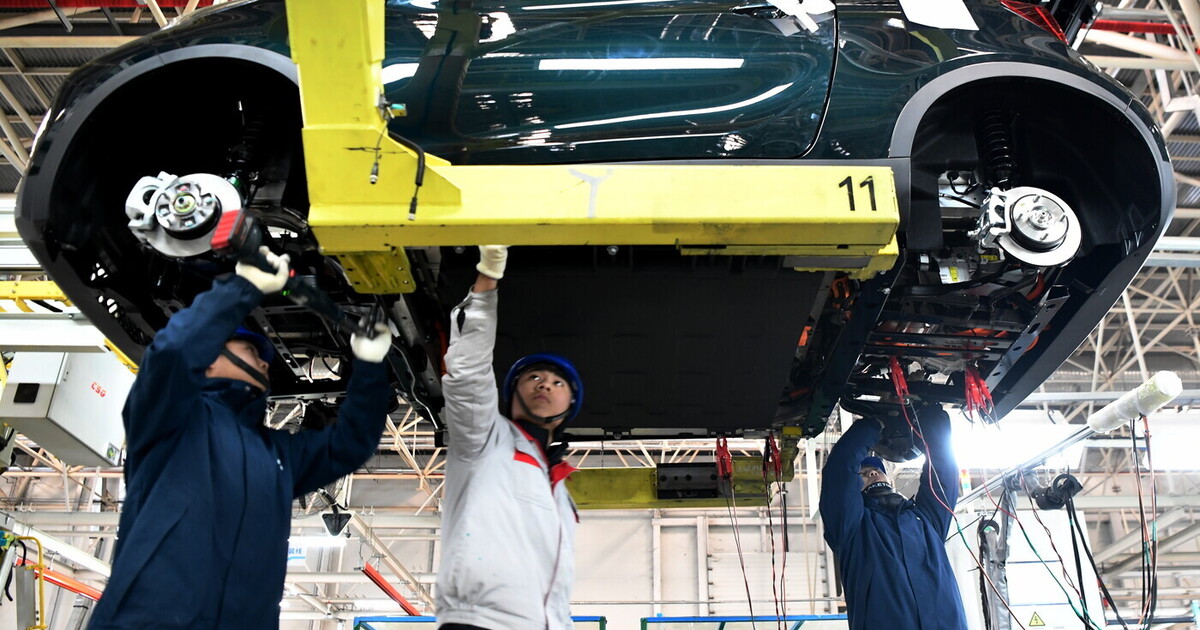 Operai assemblano veicoli elettrici presso la filiale di Shijiazhuang della Chery New Energy (Foto di Li Mingfa/VCG via Getty Images)