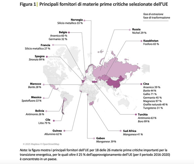 Nella mappa qui sotto ci sono i principali fornitori dell’Ue per 18 delle 26 materie prime critiche importanti per la transizione energetica, per le quali oltre il 25 per cento dell’approvvigionamento (per il periodo 2016-2020) è concentrato in un paese A distanza di due anni, “gli sforzi di diversificazione delle importazioni non hanno ancora prodotto risultati tangibili”, rileva la Corte.