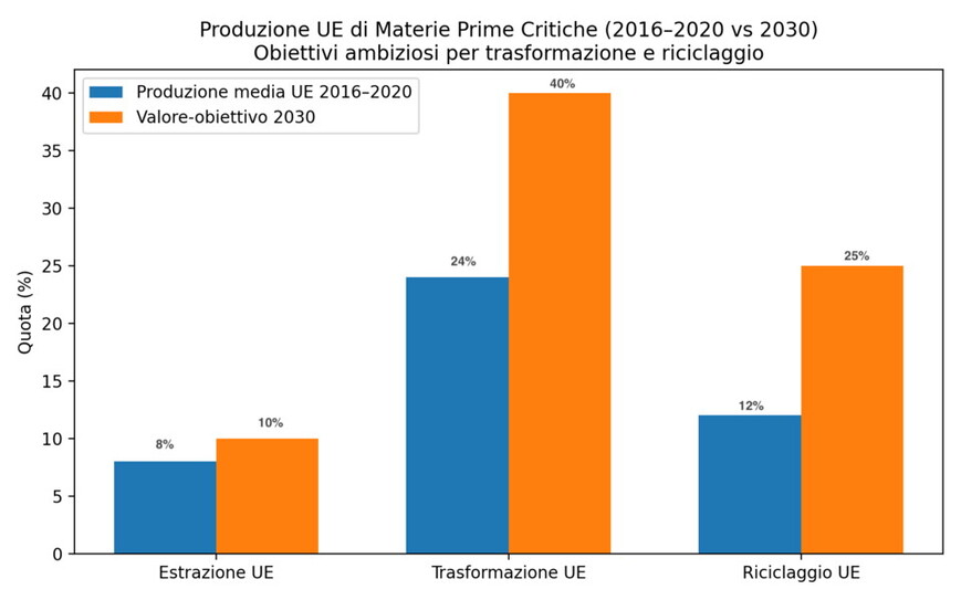 La produzione di materie prime critiche richiede le fasi di esplorazione, estrazione e trasformazione. Per ognuna di queste categorie, l'Ue si mostra ancora ben lontana dai target fissati da Bruxelles.