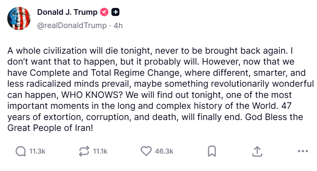 Le piazze europee hanno chiuso in calo una seduta volatile. A Milano, l’Ftse Mib ha perso lo 0,5 per cento, dopo aver oscillato più volte attorno alla parità nel corso della giornata. In rialzo lo spread Btp-Bund che è arrivato a 90 punti base. Vendite anche sugli altri listini del Continente: Francoforte ha ceduto l’1 per cento, Parigi lo 0,7. Londra è arretrata dello 0,8 per cento. Il peggioramento è iniziato nel pomeriggio, quando gli investitori sono tornati a vedere il bicchiere dei negoziati mezzo vuoto. Il presidente Donald Trump, con un post sul social Truth, ha infatti rilanciato toni durissimi nei confronti dell’Iran : “Un’intera civiltà può finire stanotte. Non voglio che accada, ma probabilmente succederà”.