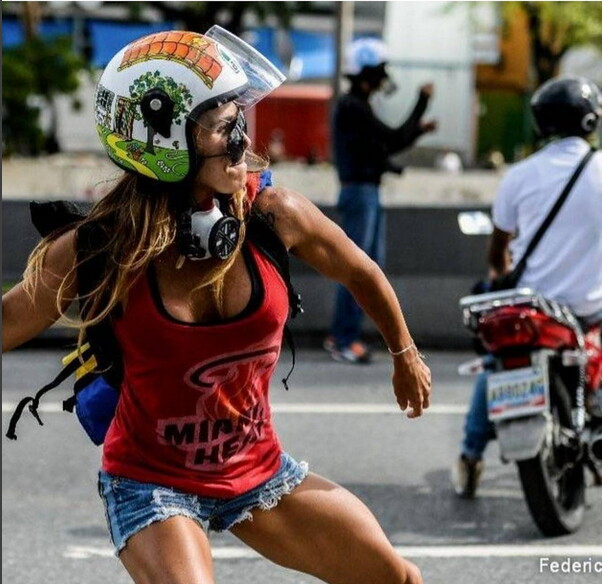 “Non vogliamo questa riforma della Costituzione: vogliamo che si rispetti la legge! Siamo arrivati al limite: la gente è stanca, il Venezuela non ne può più!”. A parlare è un simbolo, Caterina Ciarcielluti, la modella e insegnante di fitness 44enne che è diventata per tutto il mondo l’icona della protesta venezuelana, a partire da una foto in cui appare in shorts, casco e bocca coperta mentre tira un sasso. “Ero in una manifestazione, non sapevo che mi stavano fotografando”, racconta al Foglio. “Ma va bene così. Vedo che la mia immagine sta dando forza alla gente. E di forza ce ne vuole, perché ormai andiamo in piazza tutti i giorni”. In motocicletta? “A volte in moto, a volte a piedi. Ma il casco bisogna portarlo sempre. La Guardia nazionale spara i lacrimogeni in modo da farli ricadere sulla testa della gente. Se non si porta il casco o qualche altra forma di protezione, si rischia di essere uccisi”.