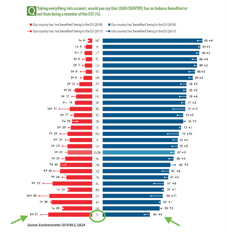 Sebbene il 44 per cento degli italiani sostenga che il nostro paese abbia tratto benefici dall'appartenenza all'Ue – 5 punti in più rispetto a ottobre 2017 – il dato ci tiene ancora in fondo alla classifica europea