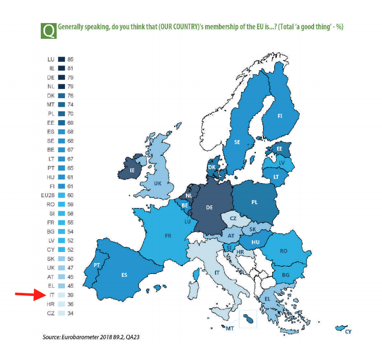 Tutto bene, insomma. E invece no, perché il sondaggio conferma che nel paese con la terza economia del blocco, nonché tra i fondatori dell'Ue, il sentimento antieuropeista rimane forte. E questo proprio mentre sta per nascere il primo governo "100 per cento anti-sistema" di tutta l'Ue. L'Italia resta la pecora nera di un'Europa che invece ha già ripreso a correre e a immaginare una svolta riformatrice. Detta coi numeri, appena il 39 per cento degli italiani intervistati ritiene che l'appartenenza all'Ue sia una cosa positiva, con un piccolo passo avanti rispetto all'ultimo sondaggio di ottobre 2017 (più 3 per cento). Rispetto agli altri stati membri, l'Italia resta saldamente al terzultimo posto nella classifica dei 28 (alle nostre spalle ci sono solo Croazia e Repubblica ceca).