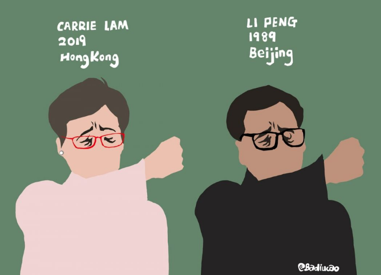 In una delle sue ultime vignette Badiucao ha disegnato Carrie Lam insieme con Li Peng, primo ministro della Repubblica popolare cinese dal 1987 al 1998, “il macellaio” responsabile del massacro di Tiananmen del 1989, la cui morte è stata annunciata ieri dal governo di Pechino. Aveva 90 anni (per gentile concessione dell’autore)