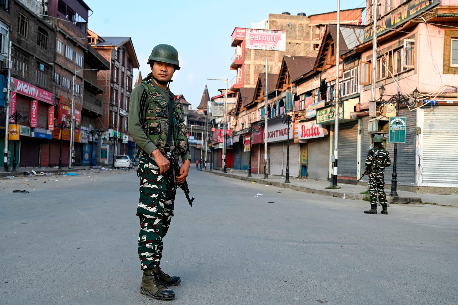 Proteste contro l'abolizione da parte dell'India dell'autonomia del Kashmir. Truppe paramilitari indiane bloccano una strada durante il coprifuoco a Srinagar