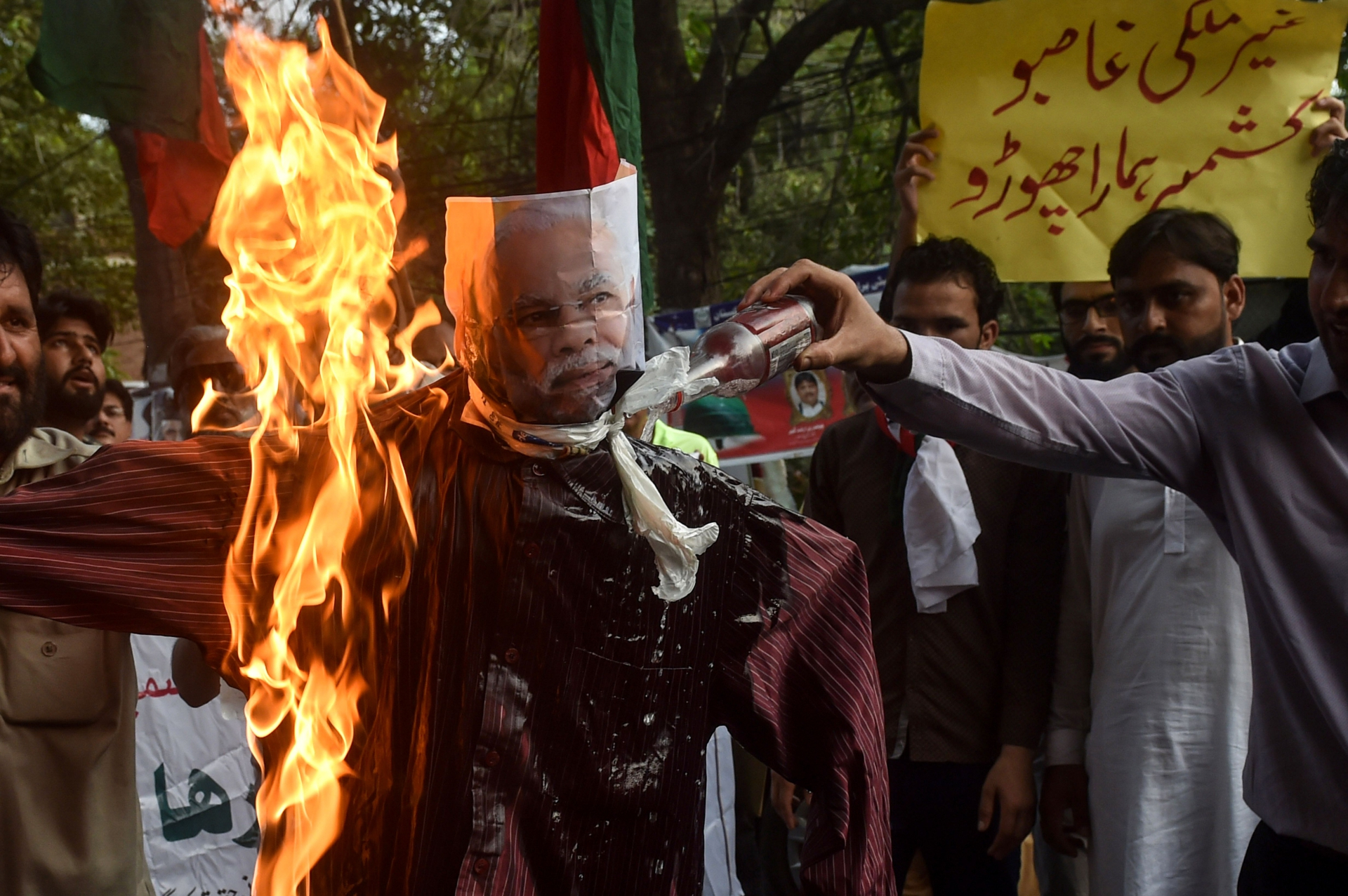 Proteste contro l'abolizione dell'autonomia del Kashmir: manifestanti bruciano il manichino di Modi (LaPresse)