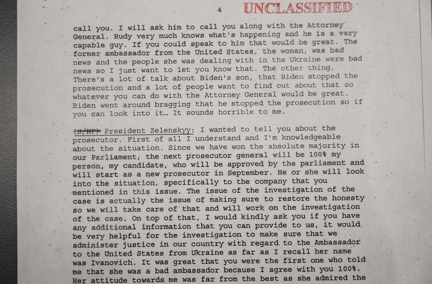 L’idea è che se una forza armata convenzionale decidesse di intervenire in Ucraina a favore dei separatisti e di avanzare e prendere altro territorio (leggi: i russi) i missili anticarro americani sarebbero indispensabili per rallentare o bloccare del tutto i tank. E infatti quando gli americani spedirono agli ucraini la prima tranche di Javelin il presidente russo Vladimir Putin ne fu molto contrariato. Trump al telefono dice di sì e risponde: “Ho bisogno di un favore però” e chiede a Zelensky due cose: una è di investigare CrowdStrike, l’altra è di lavorare assieme con il suo consigliere Rudolph Giuliani e con il ministro della Giustizia, William Barr, al fine di indagare per corruzione Joe Biden, che è il suo più importante sfidante democratico alle elezioni 2020, e il figlio Hunter – che a quel tempo lavorava nel consiglio d’amministrazione di un’industria petrolifera in Ucraina. Zelensky non si espone e se la cava bene nella conversazione, che in pratica da parte sua è una sequenza di complimenti a Trump.