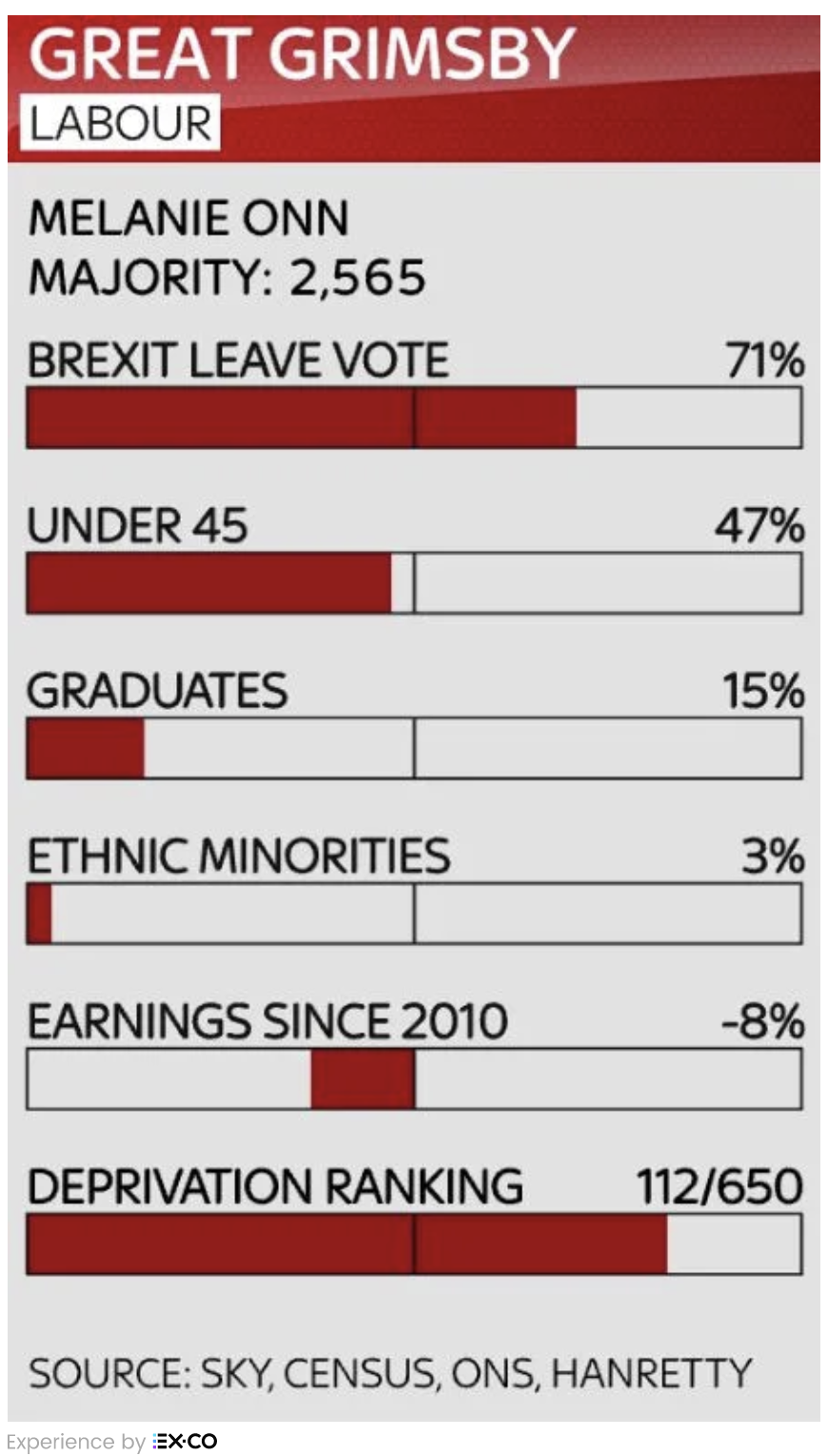 Bisognerà tenere d’occhio i risultati di Grimsby, che è il prototipo del collegio che i conservatori sperano di conquistare. È una roccaforte laburista in cui i Tory non hanno mai vinto negli ultimi settantaquattro anni ma oltre due elettori su tre hanno votato per uscire dall’Ue nel 2016. Il premier si è recato in visita a Grimsby lunedì e spera che la Brexit possa spezzare il legame secolare con il Partito laburista.