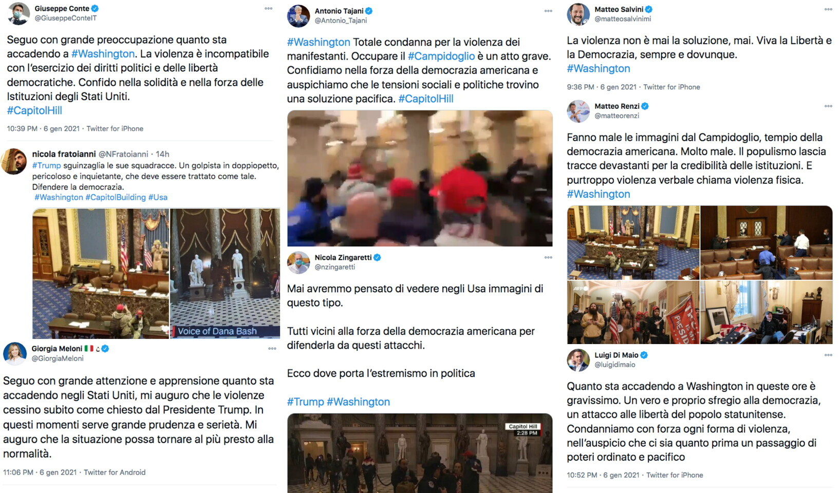 Sulla notte di violenze che ha vissuto Washington sono intervenuti anche diversi politici italiani, con dichiarazioni affidate ai social. Da Giuseppe Conte, che dice che "la violenza è incompatibile con l'esercizio dei diritti politici e delle libertà democratiche" a Luigi Di Maio, che definisce i fatti del Campidoglio "un vero e proprio sfregio alla democrazia", la condanna è unanime nel governo. Più ambigui i commenti di Matteo Salvini e Giorgia Meloni, mentre Nicola Zingaretti è subito pronto a definire gli episodi di violenza come una conseguenza dell'estremismo in politica. Da Tajani a Fratoianni, da Renzi a Calenda, ecco cosa hanno detto i politici italiani.