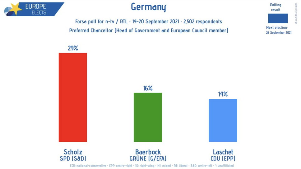 Le prossime elezioni per il Parlamento in Germania si terranno il 26 settembre. I candidati sono Armin Laschet, Olaf Scholz e Annalena Baerbock. Al momento nei sondaggi è davanti Scholz. Secondo l'ultimo sondaggio Insa l'Spd di Olaf Scholz potrebbe vincere il doppio dei seggi del collegio elettorale come Cdu-Csu di Armin Laschet mentre l'AfD è ancora primo in Sassonia e Turingia orientale.