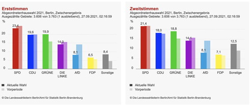 Ieri sera, mentre tutto il mondo guardava alle elezioni in Germania, Berlino guardava (anche) da un’altra parte: in particolare a altri due voti, tutti locali. Uno, quello per il sindaco è stato vinto dalla candidata di SPD Franziska Giffey, ex ministro della famiglia nel quarto governo di Angela Merkel e costretta alle dimissioni, la scorsa primavera, da un pasticcio di tesi di dottorato copiate. Lo scandalo, a quanto pare, non le ha fatto poi molto male, dal momento che, verso mezzanotte è apparso chiaro il suo vantaggio sull’altra favorita, la Verde Bettina Jarasch (22% a 19%), con la quale, da qui in poi, dovrà contendersi il ruolo di sindaco nelle lunghe e consuete trattative post elettorali tedesche.