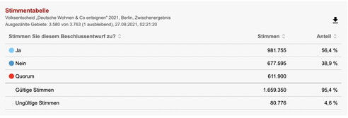 L’altro voto che ha tenuto occupati i berlinesi (la cui giornata elettorale, per altro, è stata funestata da ritardi, code e pasticci) è stato quello per il referendum per l’Esproprio dei patrimoni immobiliari di più di 3000 case. Il risultato del voto è stato positivo: ha vinto il sì con il 56%.