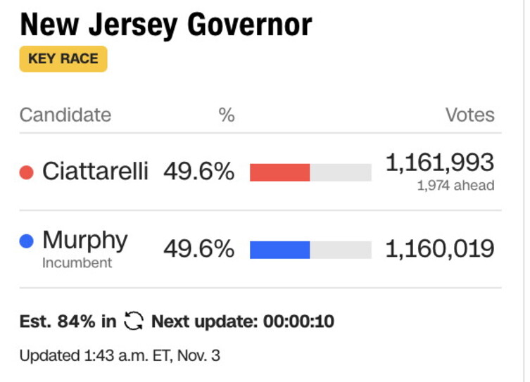 In New Jersey, invece, si sta ancora contando e i due candidati Phil Murphy (democratico) e Jack Ciattarelli (repubblicano) sono separati solo da mille voti, con il repubblicano in lieve vantaggio (anche se le schede che devono essere scrutinate dovrebbero arrivare da contee democratiche).