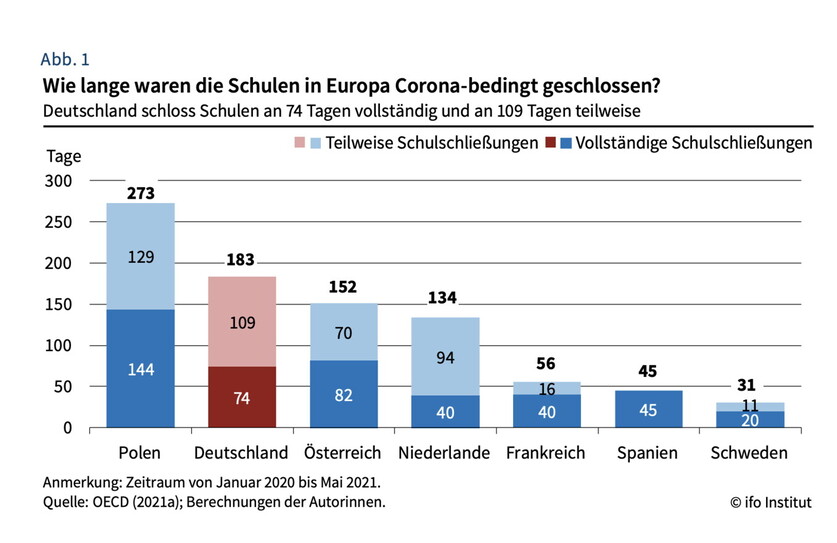 Un nuovo studio uscito il 30 novembre e pubblicato dall’Ifo institut di Monaco, mette a confronto sei paesi rappresentativi dell’Unione europea, nel periodo tra gennaio 2020 e maggio 2021: Polonia, Germania, Francia, Spagna, Svezia, Austria e Paesi Bassi. Dallo studio spicca la Svezia, che si è astenuta dalle restrizioni e ha tenuto aperte le scuole per quasi tutto il periodo. Anche Francia e Spagna, nonostante siano state duramente colpite dalla pandemia, hanno cercato di mantenere il più possibile i bambini a scuola. Le nazioni con più giorni di chiusura sono invece la Germania e la Polonia; da questi sondaggi i genitori dei bambini hanno confermato che più i figli rimangono a casa, meno tempo dedicano all’apprendimento.