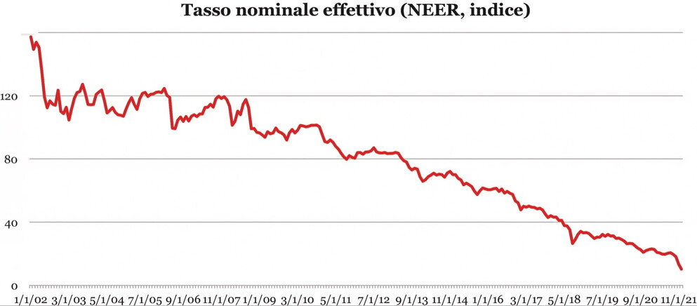 Il recente deprezzamento della lira turca ha suscitato attenzione mediatica più per il quadro istituzionale che in ottica storica. Nel dibattito attuale sfugge infatti che negli ultimi 20 anni la lira turca si è deprezzata rispetto alle valute dei principali partner commerciali a un tasso medio annuo del 24 percento. La figura di seguito mostra l’andamento del tasso nominale effettivo (ovvero il valore indice della lira turca nei confronti di tutte le divise dei paesi con i quali intrattiene rapporti commerciali). Esclusi gli anni precedenti la grande recessione, il deprezzamento della lira turca non ha conosciuto pausa tanto che a fine 2021 il suo potere d’acquisto era stimabile in quindici volte inferiore rispetto ad inizio 2002.