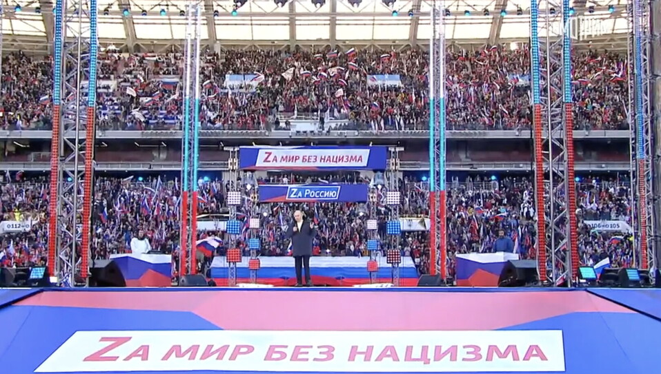 Sul palco, alle spalle di Putin, campeggiano due cartelli - "Per un mondo senza nazismo" e "Per la Russia" - mentre sugli spalti sventolano bandiere russe e bandiere raffiugranti la "Z", ormai simblo della propaganda russa. Anche gli artisti e i cantanti che hanno partecipato all'evento esponevano sulle loro giacche la lettera Z.