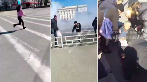 Lacrimogeni e raffiche di armi da fuoco sui civili che protestavano contro l'occupazione russa della città sul Mar Nero. La notizia è stata rilanciata anche dal ministro degli Esteri ucraino, Dmytro Kuleba. In alcuni video pubblicati su canali social e Telegram locali, dai quali tuttavia non è facile capire chiaramente la dinamica dell'accaduto, si sentono i suoni di esplosioni (forse granate contenenti gas lacrimogeni, che poi si vedono disperdersi nell'aria) e raffiche di armi da fuoco. Almeno un ferito.