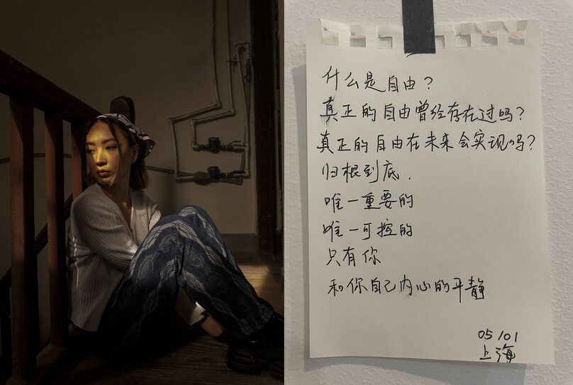 Jenny, fotografata a distanza nel suo appartamento di Shanghai il 1 maggio 2022. Nei suoi appunti scrive: “Che cos’è la libertà? Esisteva davvero? Esisterà in futuro? Alla fine della giornata, ciò che conta davvero, ciò che è veramente controllabile sei tu e la tua pace interiore”