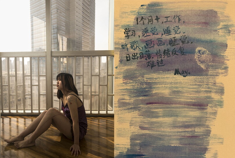 R. fotografata a distanza nella sua camera da letto a Shanghai, il 2 maggio 2022. Nei suoi appunti scrive: “Più di un mese (di lockdown), lavoro, studio, sonno e di nuovo dormi, ascolta la musica, disegna, dormi, il sole sorge e il sole tramonta, sbalzi d’umore e non mi sento bene”