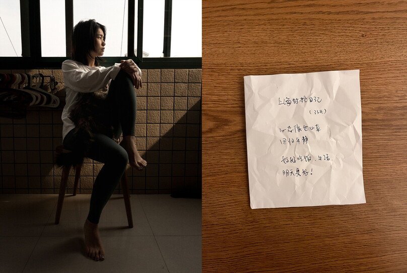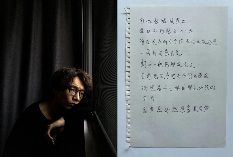 ManChunHin, fotografato a distanza nel suo appartamento di Shanghai il 20 aprile 2022. Scrive nei suoi appunti: “Mi sono preso il Covid-19 mentre facevo la fila per fare il test, sono stato portato in un campo di quarantena per 10 giorni dove ho dormito in una piscina convertita in centro di isolamento con altre 200 persone. Poi sono guarito da solo nel campo di quarantena, non mi hanno dato medicine, e sono tornato a casa. Voglio solo mangiare da McDonald’s”