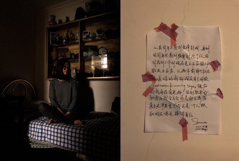 Chengcheng, fotografata il 28 aprile 2022. Scrive: “Da un blocco nel Regno Unito a un altro blocco qui a Shanghai, dal trovare un lavoro all’essere disoccupata a casa, dall’essere sempre indaffarata due anni fa all’avere il tempo per lo yoga e la meditazione mattutine. Sono migliore? Tornerei a essere ansiosa o peggio, dopo essere tornata alla mia vita normale? Sono ancora sola, e cerco di accettarmi”