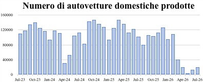 Gli effetti delle nostre sanzioni si vedono ancora meglio guardando i numeri disaggregati. Riportiamo i tre più indicativi. Il primo dato è quello della borsa di Mosca che rimane il 37% al di sotto del livello pre invasione senza segnali di recupero. Gli agenti finanziari, che scontano l’andamento dei flussi di cassa futuri delle aziende quotate, stimano una perdita di ricchezza enorme poiché ritengono che lo shock negativo sia permanente. Il secondo dato riguarda la produzione di autovetture domestiche. Il grafico qui sotto riporta l’andamento del numero di autovetture domestiche prodotte tra Luglio 2019 e Luglio 2022. Gli ultimi dati indicano che la produzione si è quasi azzerata e la ragione è da trovarsi nelle difficoltà di approvvigionamenti di componenti intermedi importati, ovvero sotto sanzione (si veda al riguardo anche l’ultimo PMI report di S&P).