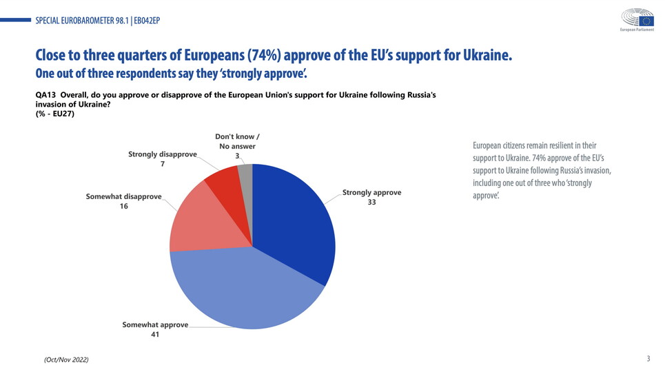 A dieci mesi dall’inizio dell’invasione russa in Ucraina, quasi tre quarti degli europei, il 74 per cento, approvano il sostegno dell’Ue a Kyiv, secondo l’ultimo sondaggio Eurobarometro. Un intervistato su tre dice di “approvarlo fortemente”. L’indagine – commissionata dal Parlamento europeo e condotta tra il 12 ottobre e il 7 novembre 2022 – fotografa un tasso di approvazione altissimo in Svezia (97 per cento), Finlandia (95 per cento), Paesi Bassi (93 per cento), Portogallo e Danimarca (92 per cento). Ma in Italia le cose vanno diversamente. Da noi si dice favorevole al sostegno all’Ucraina appena il 63 per cento degli italiani, ben al di sotto della media europea che si attesta al 74 per cento.