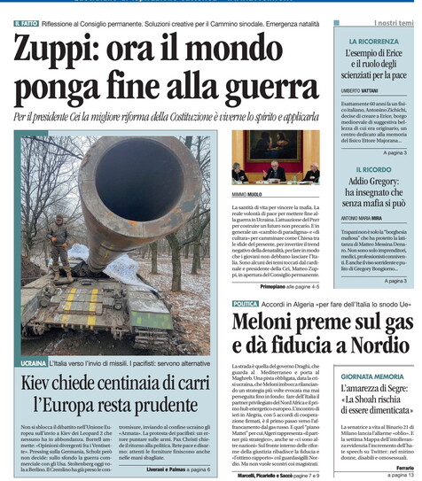 Qualcosa che avrebbe potuto fare anche il presidente della Cei, il cardinale Matteo Zuppi quando ha detto che "la necessità della pace e l'urgenza di raggiungerla innanzitutto per amore del popolo ucraino! Ogni giorno che passa significa morte, lutto, odio. La guerra è terribile, contagia nel mondo globale, provoca tante sofferenze nel mondo intero, come vediamo con la crisi alimentare che fa pagare un prezzo a popolazioni inermi e lontane, causa un riarmo preoccupante e pericolose, insieme a ricadute belliche in altre parti del mondo come la Siria o il Caucaso. Il mondo deve porre fine a questa guerra e affrontare seriamente gli altri conflitti aperti, che sono meno sotto gli occhi di tutti, ma pure così dolorosi".